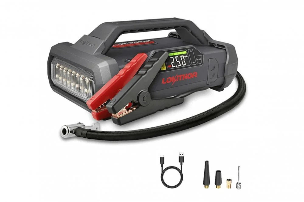 The Lokithor JA302 is a multi-function car jump starter power pack that delivers 2500A peak amps for starting of 12V vehicles (up to 8.5-Liter gasoline and 6.5-Liter diesel) in a few seconds. It features a compact design that combines a jump starter with air compressor, with Lithium-ion battery inside make JA302 only weight about 3.9lbs, and is far lighter than lead-acid jump starters, and more environmentally friendly. It's a great emergency tool for overlanding, adventure, camping, fishing, hunting, bicycling.