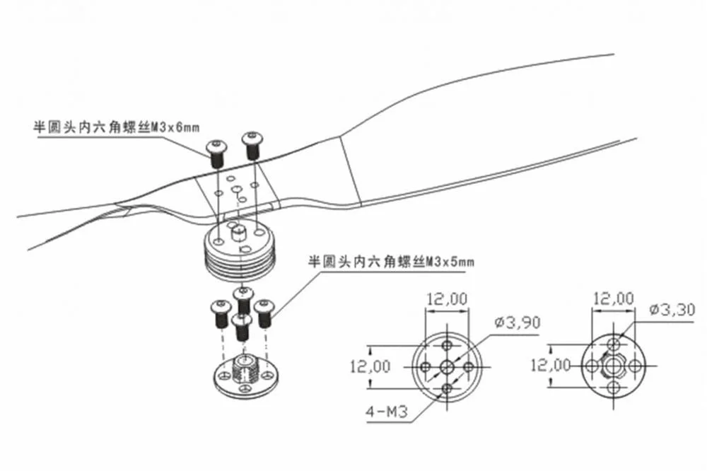 Product Description 6061T6 Aluminum Alloy applied, full CNC processed. Applicable motors: motor shaft less than 4MM, M3 Installation pitch 12MM. To loose: turn the prop adapter counter-clockwise. To tight: turn the prop adapter clockwise.